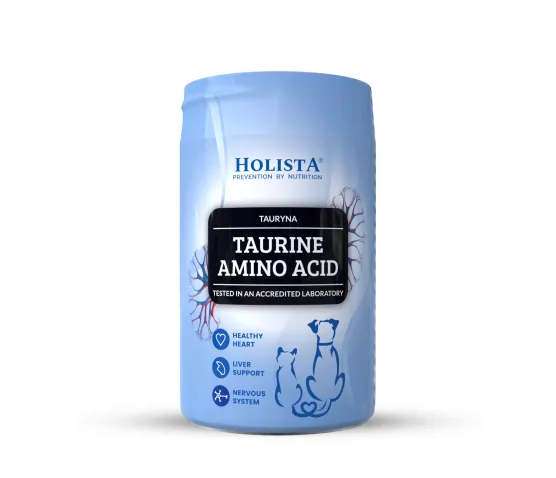 Tauryna dla psa i kota marki Holista. Tauryna bierze udział w wielu procesach fizjologicznych organizmu, wspiera funkcjonowanie wątroby oraz serca, przyspiesza regenerację mięśni, poprawia metabolizm. Właściwości tego aminokwasu mają pozytywny wpływ na poprawne działanie układu nerwowego. Tauryna jest niezbędnym elementem diety kotów jak również psów będących na diecie wysokotłuszczowej. Suplementacja rekomendowana jest w celu bilansowania diet gotowanych oraz B.A.R.F.